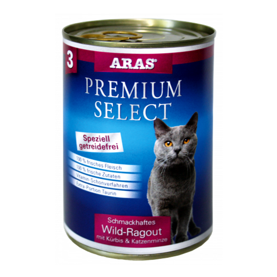 Das ARAS Premium Select Katzenfutter mit viel frischem Fleisch (97%) in Lebensmittelqualität in der Sorte Wild-Ragout mit Kürbis und Katzenminze enthält alle natürlich vorkommenden Vitamine. Durch die schonende Zubereitung (Vitamin-Schonverfahren) kann eine ausreichende Vitaminversorgung garantiert werden. Die 100% frischen Zutaten sorgen für eine besonders ausgewogene und schmackhafte Ernährung Ihrer Katze. Angereichert wird dieses Nassfutter für Katzen mit der natürlichen, essentiellen Aminosäure Taurin. Taurin ist für die Gesundheit der Katze lebensnotwendig und kann, im Gegensatz zum Hund, von der Katze nicht selber gebildet werden. Der Einsatz von Tier- und Knochenmehlen oder die Beimengung von gentechnisch veränderten Ersatzstoffen (Surrogate) wie Mais und Soja, sowie die Anreicherung mit Abfallprodukten aus der Lebensmittelindustrie sind bei der ARAS Tiernahrung garantiert ausgeschlossen.- mit 100% frischem Fleisch in Lebensmittelqualität